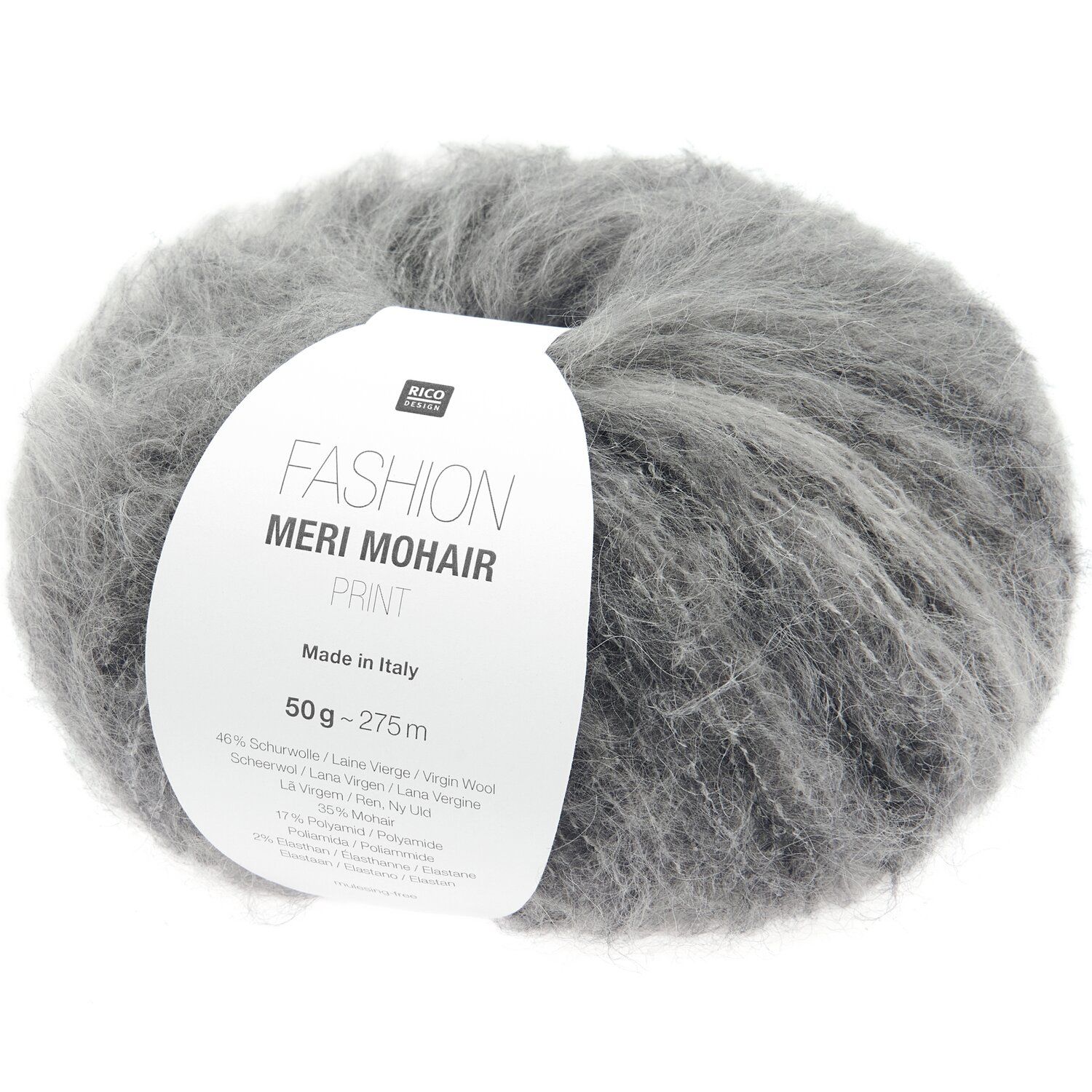 wunderschöne, flauschige Wolle zum Häkeln und Stricken. Handarbeiten von kuscheligen Pulovern oder Strickjacken ist ein tolles Hobby. Selbst gestrickte oder gehäkelte Kleidungsstücke sind einzigartig und individuell. 50 g Fashion Merino Mohair Wolle mit einem leichten Print, Made in Italy