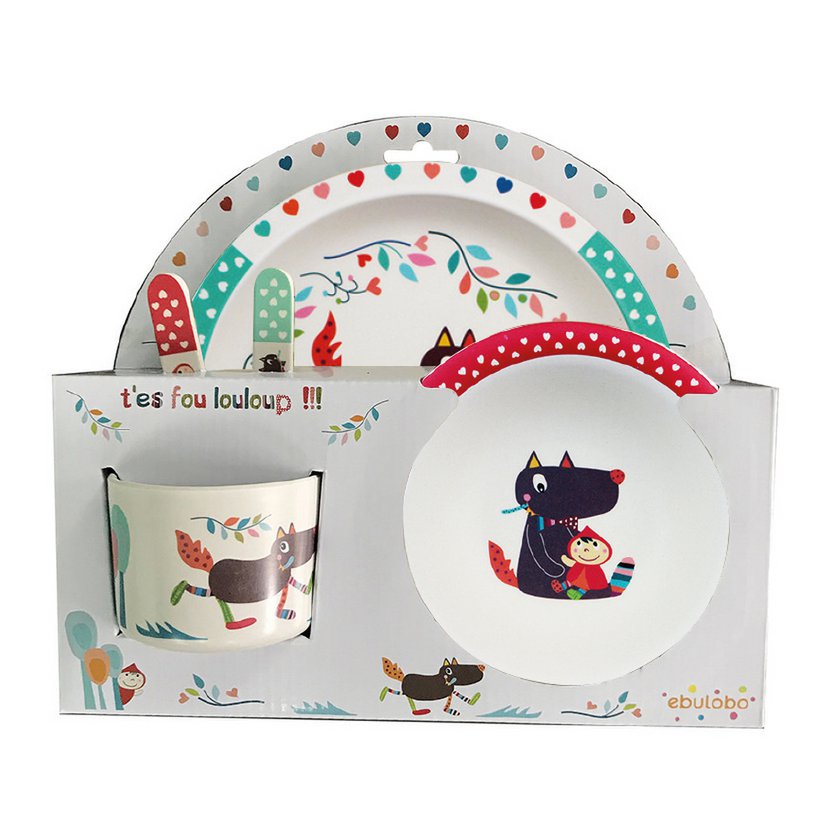 Komplette Louloup-Mat-Box mit Randteller, Besteck, Pauke und Schale. Bestehend aus 100 % Melamin. Größe: 27x25x5